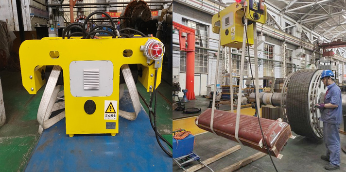 首先,工藝部對裝壓工具進行了升級。同步電機的磁極翻身,一直以來采用的是人工繞繩的方法。此方法繞繩調整不方便,耗時長,且容易造成磁極的磕碰。工藝部經研究,引進了先進的自動磁極翻身工具,不僅安全可靠,方便實用,還在縮短了翻身時間的同時,保護了磁極不受到磕碰。