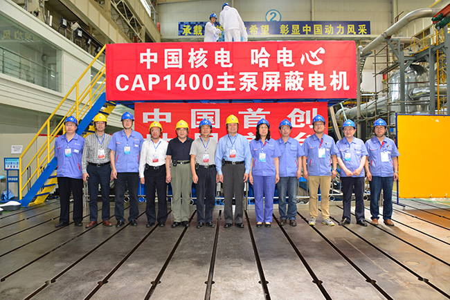 由哈電動裝公司自主設計研發的世界首臺國家重大專項示范工程CAP1400主泵屏蔽電機樣機,目前已完成整機總裝并開展出廠試驗,王炳華董事長等領導在現場見證了主泵電機的啟動及升速試驗。試驗開始后樣機運轉平穩,各項性能指標均完全滿足設計要求。